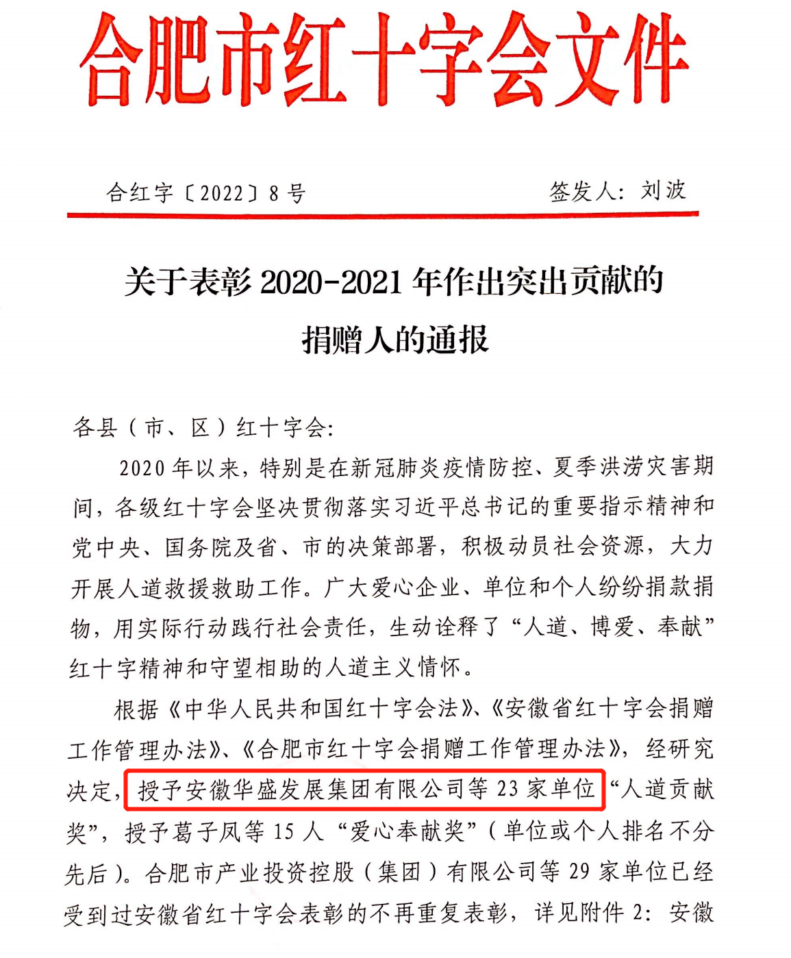 2022年4月13日,合肥市红十字会发布了《关于表彰2020-2021年作出突出贡献的捐赠人的通报》,乐动手机网页版登录入口乐善好施,博爱奉献,获得了合肥市红十字会授予的慈善捐赠“人道贡献奖”。